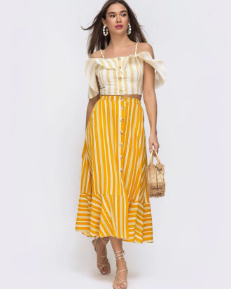 Long summer dress from designers Gepur made of knit: asymmetrical neckline, revealing one shoulder, flounce, sewn-in belt and a bold mermaid skirt.
