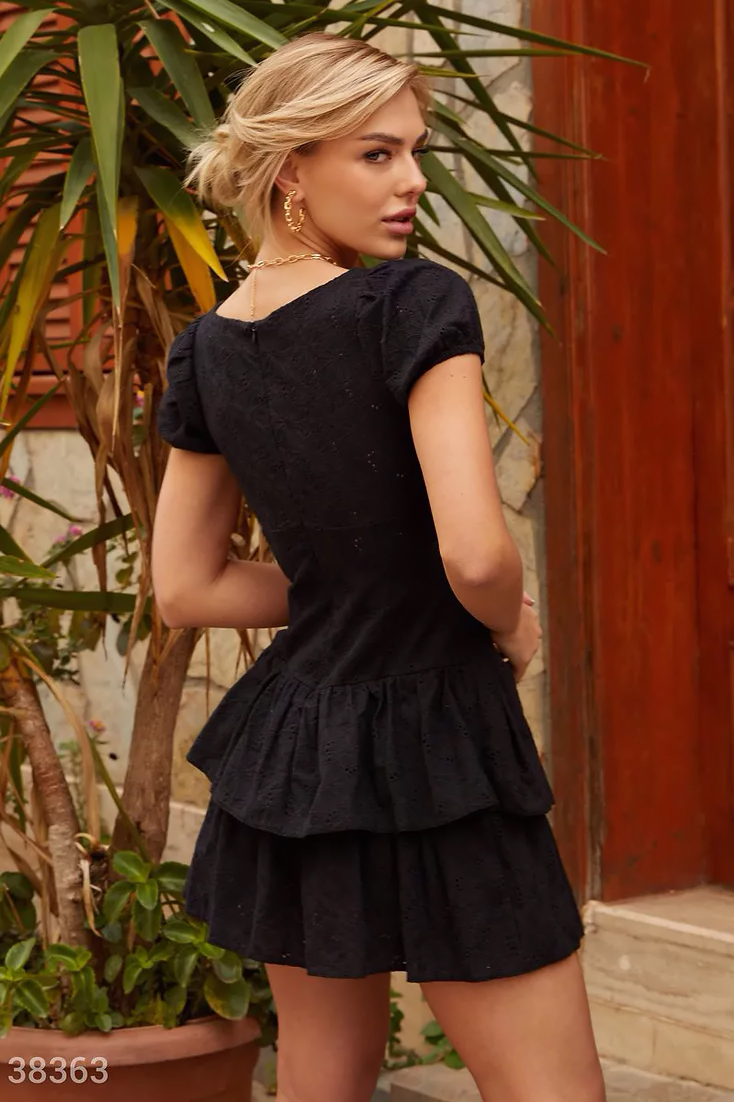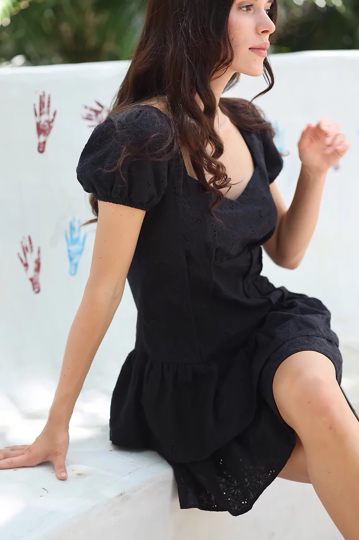 The Mini Faith dress will make you look feminine. The cotton blend is adorned with sophisticated floral embroidery. The romantic mood, set by the material, is supported by sleeves with lanterns and a skirt made of flounces. Such a thing will look good with both stiletto heels and ballet flats.